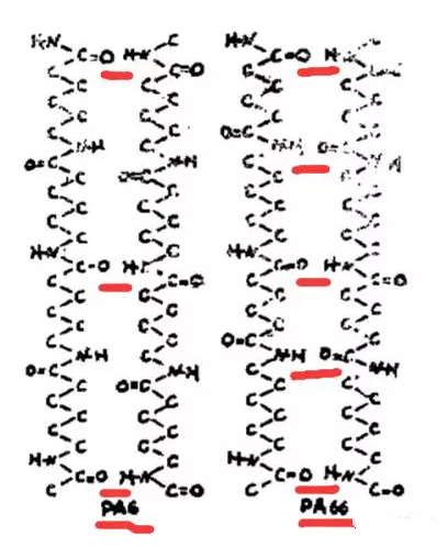 想要分析他們有什么區(qū)別,就要先從他們的結(jié)構(gòu)入手,大家都知道,PA6是由己內(nèi)酰胺開環(huán)聚合而成,而尼龍PA66由己二胺與己二酸縮合聚合物得到。PA6與PA66具有相同的分子式,但是結(jié)構(gòu)式不同,而正是由于這點(diǎn)差別導(dǎo)致了其性質(zhì)的不同,如分子間氫鍵作用力不同。