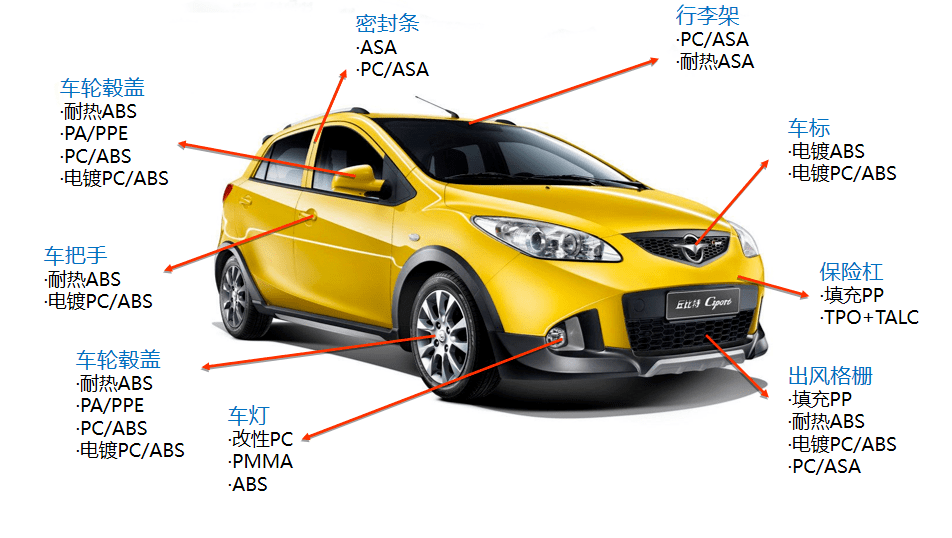 目前常用的外飾材料有 PP(聚丙烯)、ABS(丙烯腈-丁二烯-苯乙烯塑料)、ASA(苯乙烯、丙烯腈和壓克力橡膠共聚)、POM(聚甲醛)、PA(尼龍、聚酰胺)、PC(聚碳酸酯)、PE(聚乙烯)等,但具體到每一個零件所使用的材料又有所不同,以下針對具體的零部件系統介紹材料的選擇和應用情況。