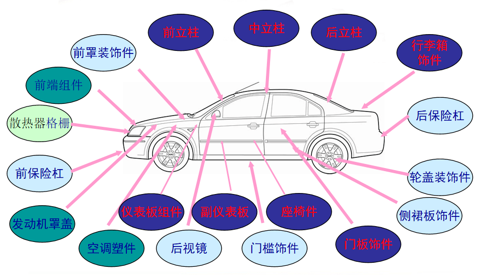 儀表板,副儀表板,立柱,門板,座椅部件等。