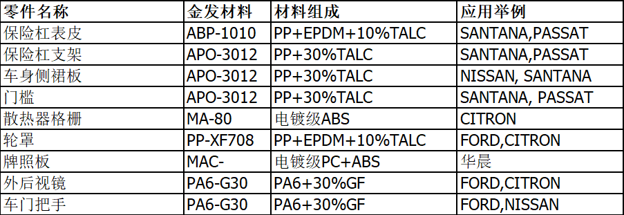 保險杠(前后,內襯),車身側裙板,防擦條,輪罩,輪蓋裝飾件,門檻,散熱器格柵,牌照板等。