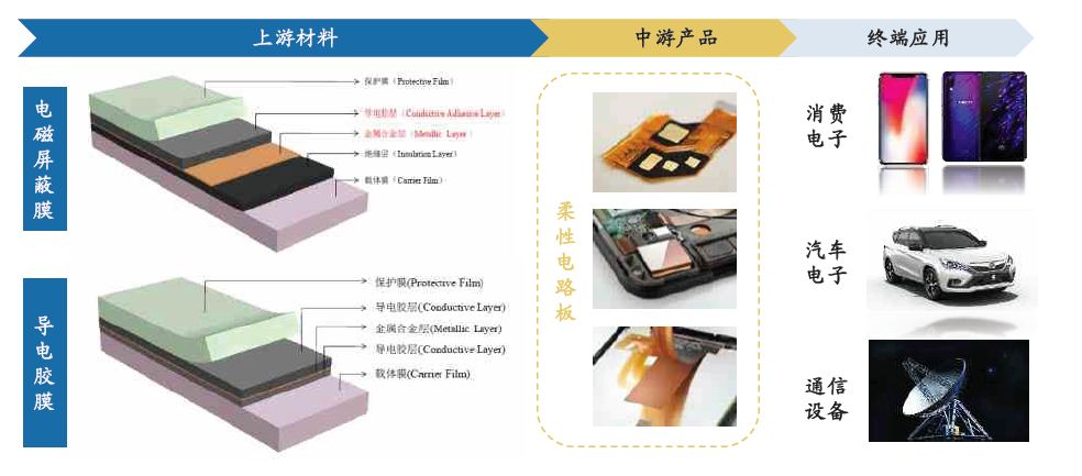 5G 時代由于高頻高速的通信需求,對智能手機內(nèi)部的電磁屏蔽需求也產(chǎn)生了增量需求,而在FPC 上依次壓合覆蓋膜、電磁屏蔽膜成為解決電磁屏蔽問題的重要方案,廣發(fā)證券預計伴隨軟板化趨勢和5G 時代的需求,對應屏蔽膜的廠商有望獲得加速成長。